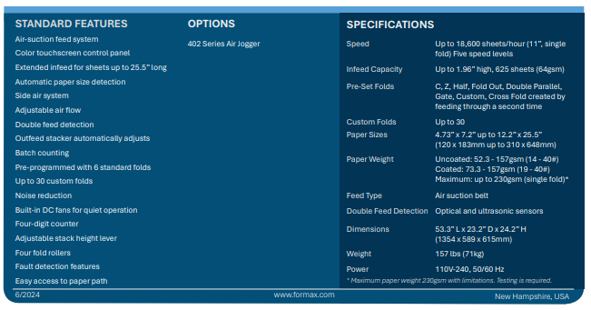 It’s designed to handle a variety of paper weights and sizes, up to 25.5” long, combining an extended infeed tray with variable fan speed and air flow that can be adjusted independently using the interactive control panel and external adjustment knobs.
