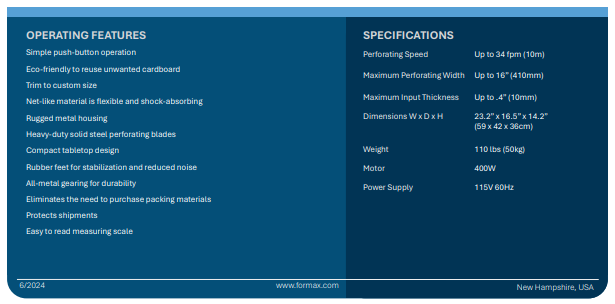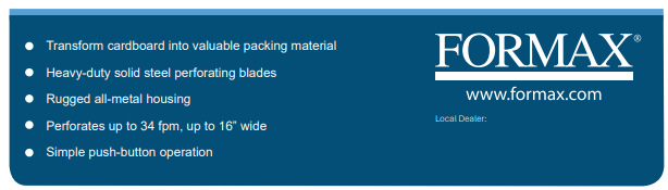 The Greenwave 410 perforates cardboard at up to 34 feet per minute, up to 16” wide, and up to 0.4” thick. It can reduce the cost of purchasing shipping materials and waste hauling, while upgrading packaging material to a high-quality, sustainable alternative to single-use plastic and foam packing products.