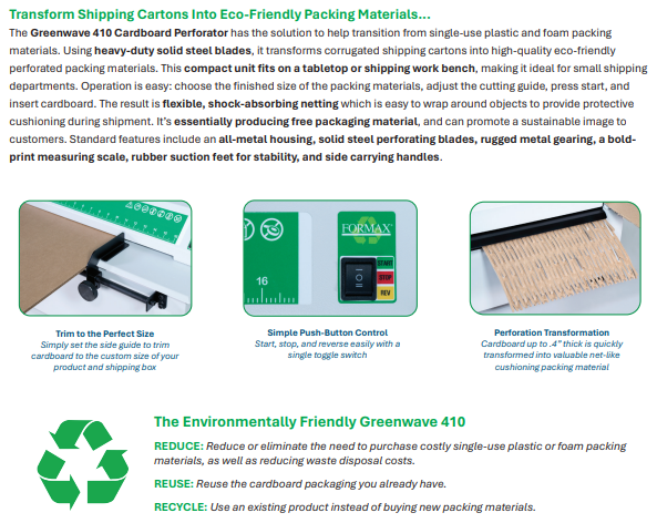 The Greenwave 410 Cardboard Perforator has the solution to help you transition away from single-use plastic and foam packing materials.