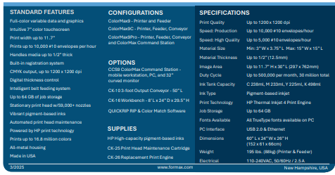 The ColorMax9 is available in three configurations with options including a 3-foot output conveyor, sturdy workbench, and the CCS9 Command Station featuring a free-standing workstation, PC, and 32” curved monitor.