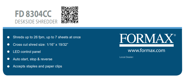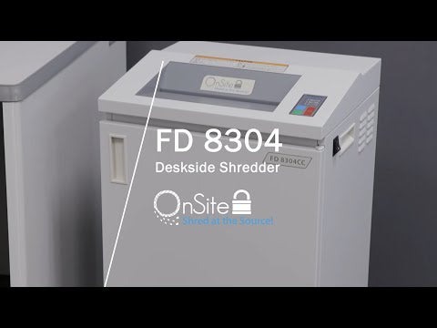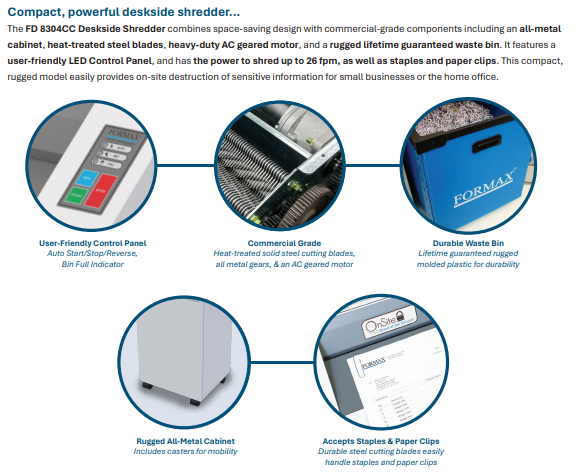 The FD 8304CC Deskside Shredder combines space-saving design with commercial-grade components including an all-metal cabinet on casters, heavy-duty AC geared-motor, and rugged lifetime guaranteed waste bin.