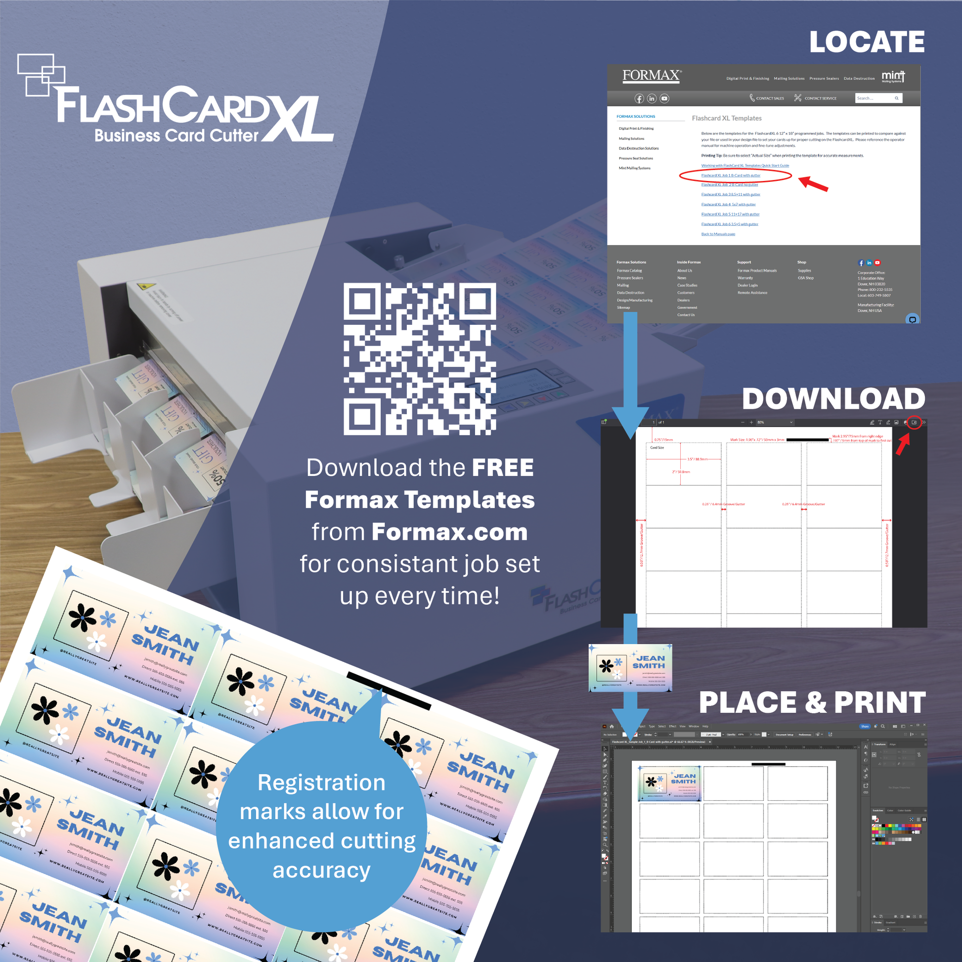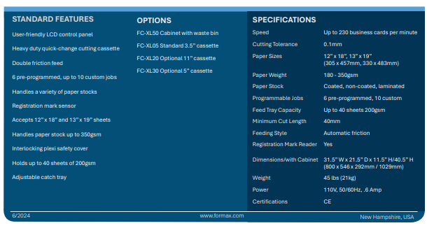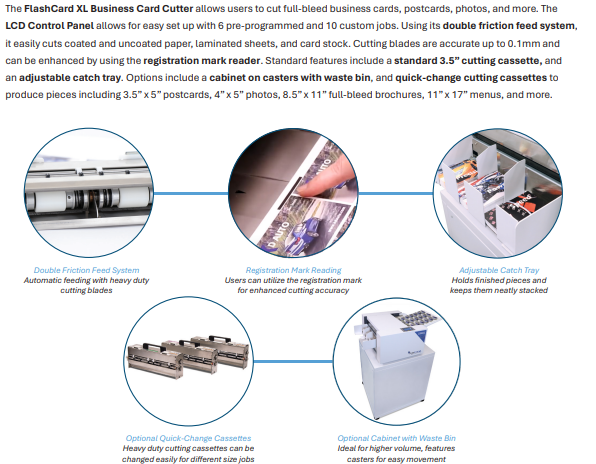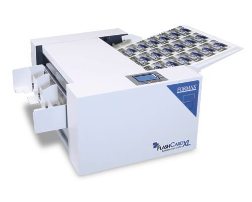 The Formax FlashCard XL Business Card Cutter is a large format, high-quality solution for short-run production of full-bleed business cards postcards, photos, and more. Its rugged and intuitive design allows users to cut cards on demand at up to 230 business cards per minute.