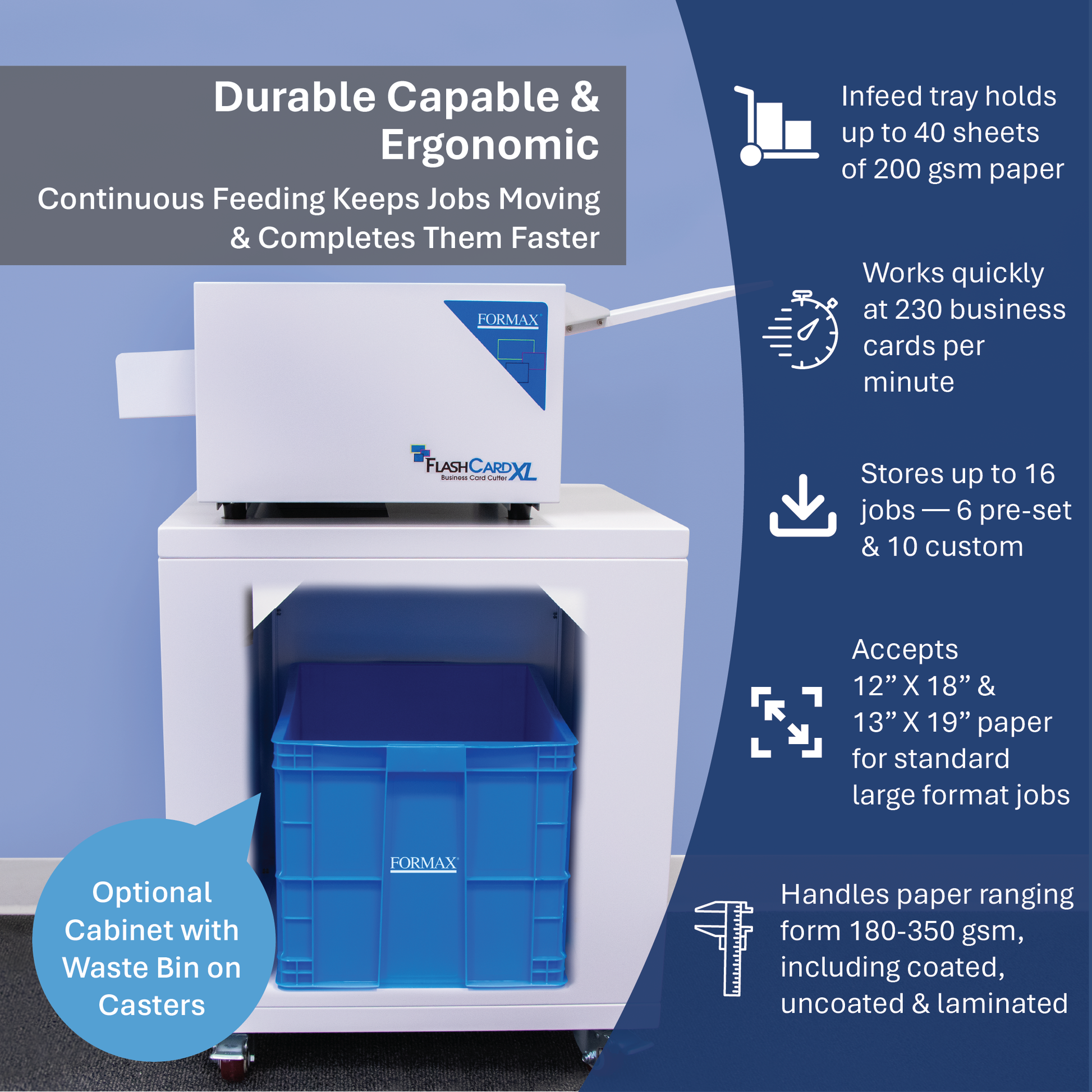 Featuring a user-friendly LCD display, it’s easy for operators to choose one of 6 pre-set jobs or enter and save up to 10 custom cuts. The FlashCard XL is pre-programmed to process 12” x 18” and 13” x 19” printed sheets. The infeed tray holds up to forty 200gsm sheets at a time, and can accommodate paper weights up to 350gsm / 130# cover. The optional cabinet with wastebin is ideal for users with increased volume, and features casters for easy movement and storage.