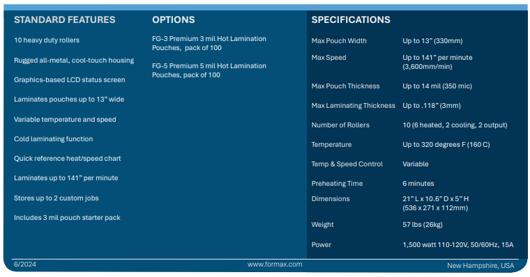 The 13R10 handles pouches up to 13” wide, up to 14 mil, with a maximum laminating thickness of up to 3mm. Formax offers 3 mil and 5 mil laminating pouches for standard letter size 8.5” x 11” projects.