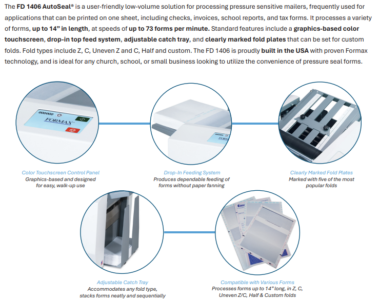 The FD 1406 AutoSeal offers a user-friendly low-volume solution for processing one-piece pressure sensitive mailers. Its color touchscreen control panel is graphics-based, making it easy for anyone to use. With a speed of up to 73 forms per minute and the ability to process forms up to 14” in length, the FD 1406 enables operators to complete daily processing jobs with ease.