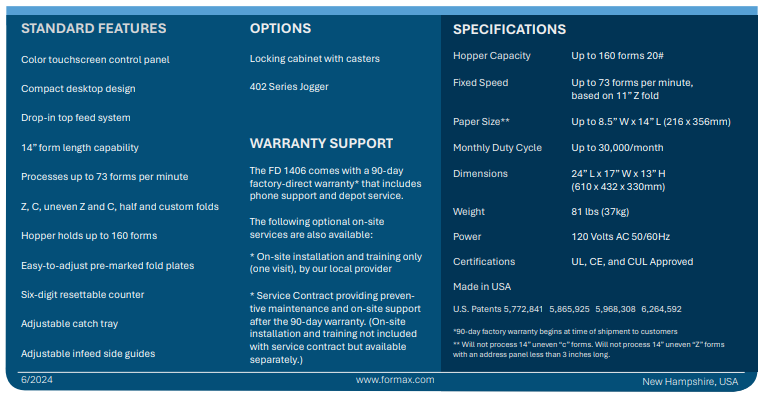 Standard features include redesigned fold plates that are clearly marked and easier to adjust, a six-digit resettable counter, and drop-in top feed system, all in a compact and sleek desktop design. Fold plates are pre-marked for standard folds for 11” and 14” form sizes, and can be easily adjusted for custom folds.
