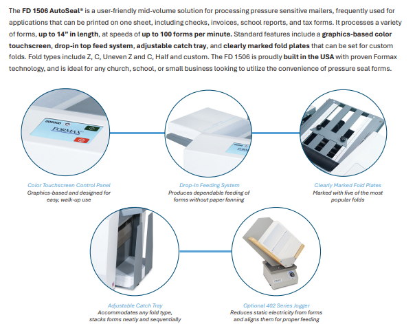 The FD 1506 AutoSeal is an ideal mid-volume solution for processing one-piece pressure sensitive mailers. It features an innovative graphics-based color touchscreen control panel, one of the first in the industry. The touchscreen uses internationally-recognized symbols in place of text, making it easy for anyone to use.