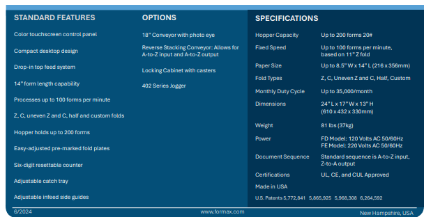 The compact design and user-friendly touchscreen make this unit ideal for processing documents in an office or school environment with mid-volume applications. Built in the USA with proven Formax technology, the FD 1506 provides an economical solution with the quality and reliability you have come to expect from Formax.