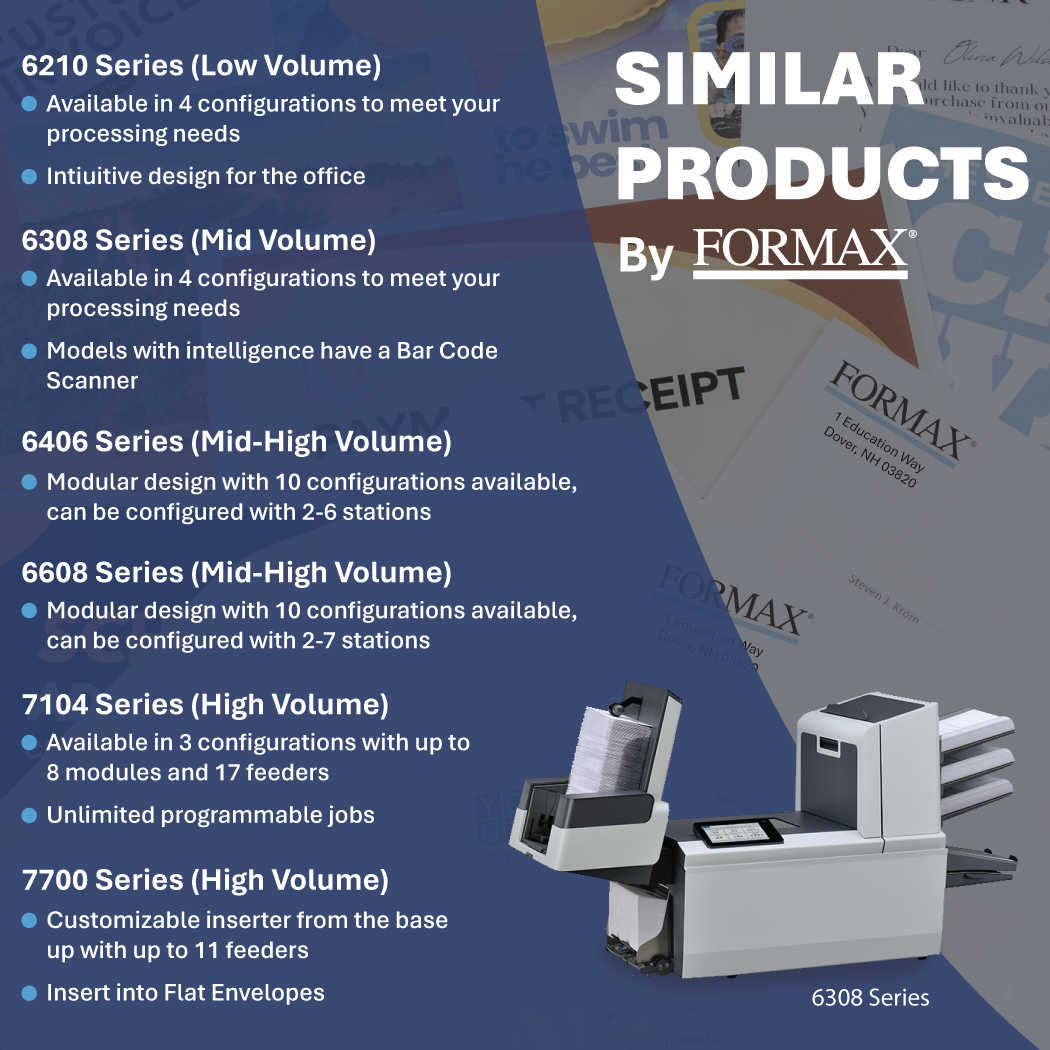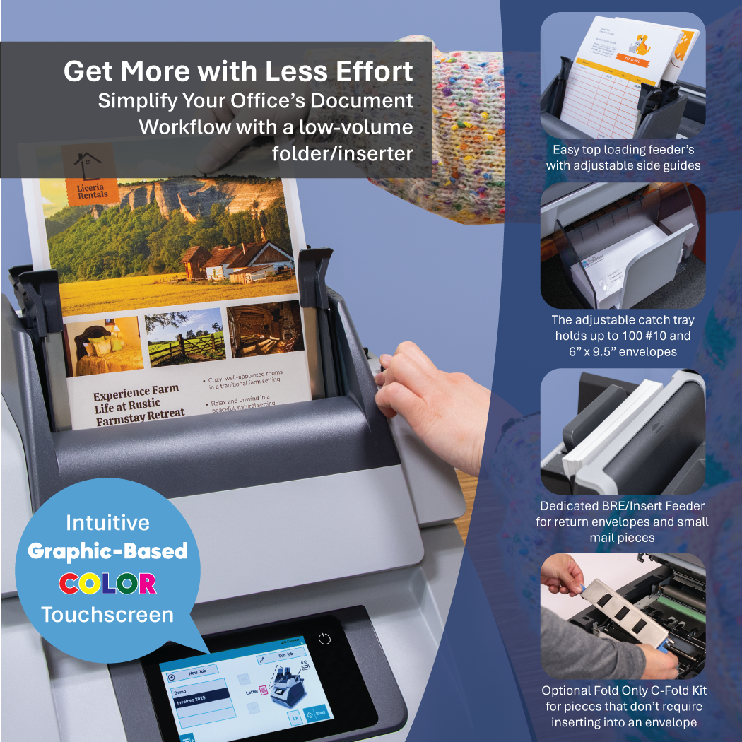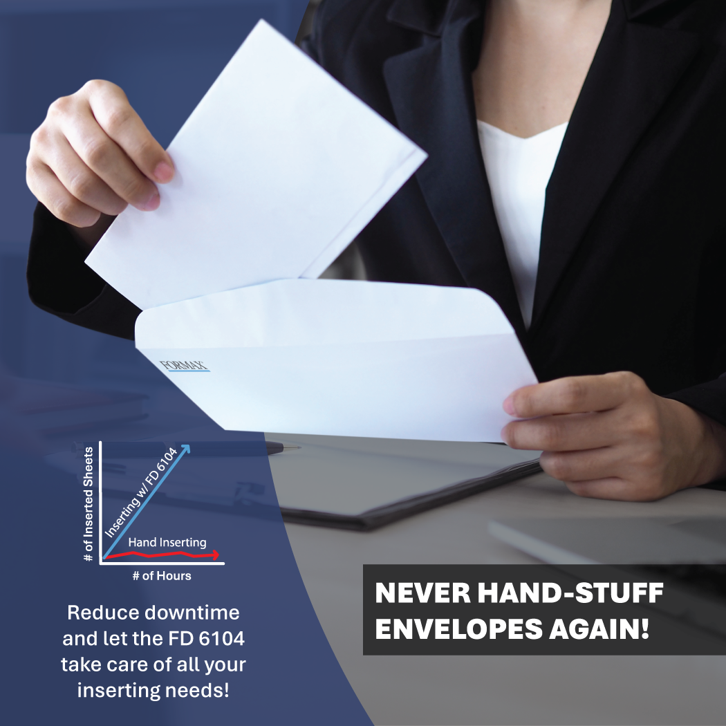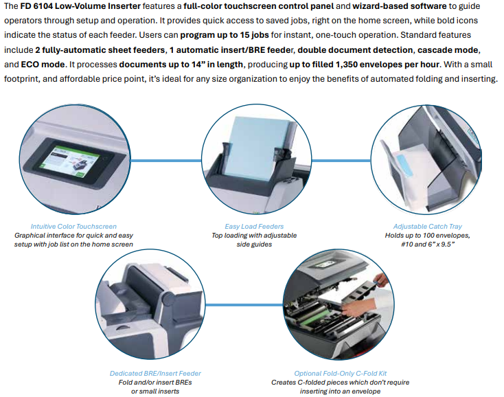 Don’t waste any more valuable time and money manually folding and inserting. Automate your mailings with the FD 6104 and maximize your company’s efficiency.