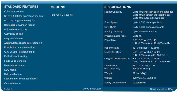An optional Fold-only C-Fold Kit is available for those who need to produce C-folded documents without inserting into an envelope, ideal for brochures and marketing pieces. The kit is easily installed without tools, simply by swapping out the moistener kit.
