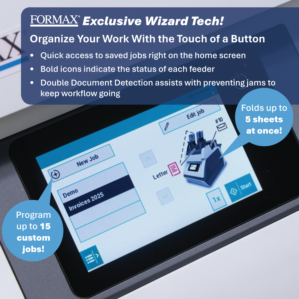 The 5” full-color touchscreen control panel features wizard-based software which guides operators through setup and operation. It provides quick access to saved jobs, right on the home screen, while bold icons indicate the status of each feeder. Users can program up to 15 jobs for instant, one-touch operation.