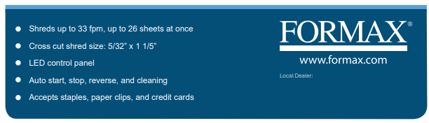 The Formax OnSite FD 8402CC Office Shredder offers commercial-grade components in a sleek, practical design. An easy-to-use LED control panel puts the power right at your fingertips.