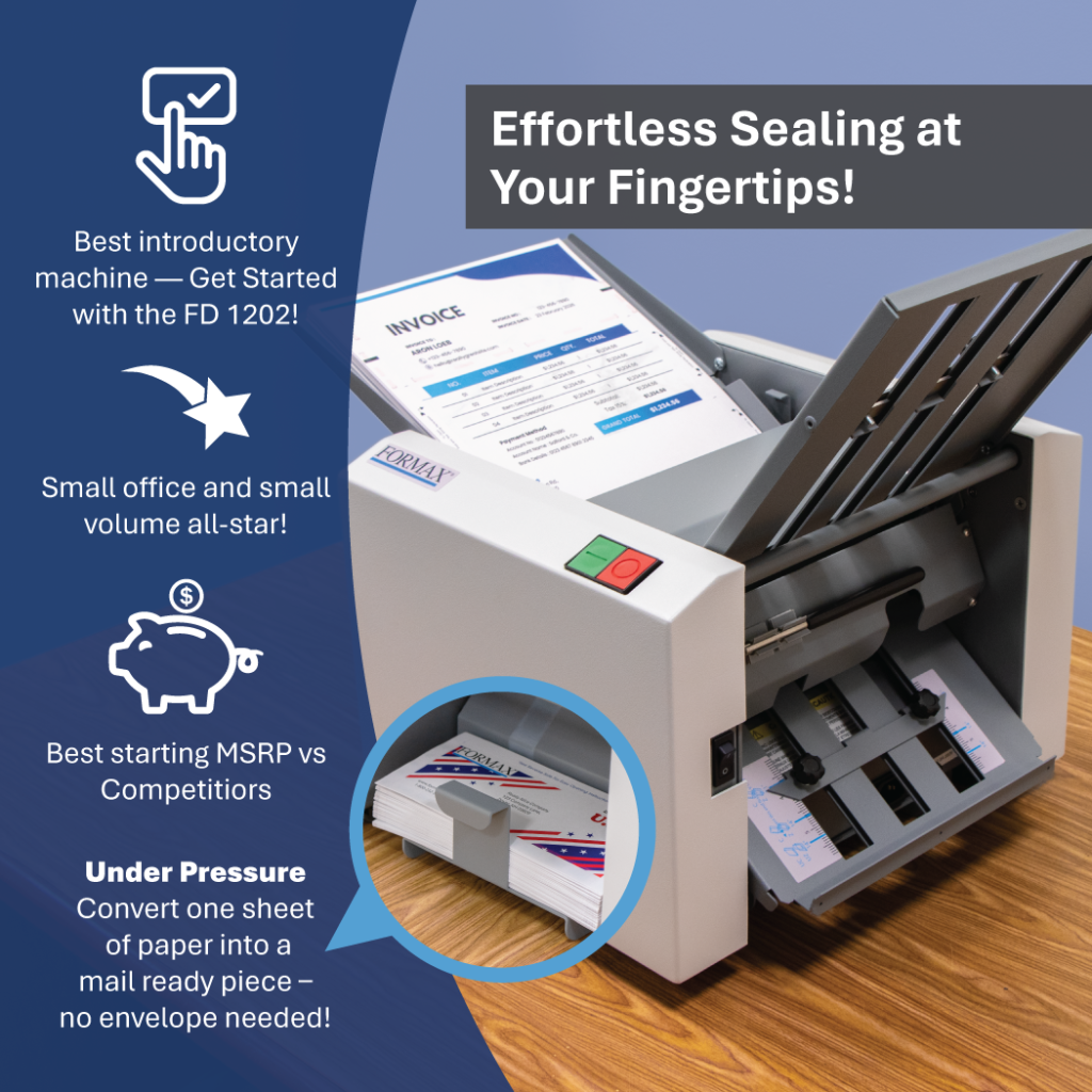 The FD 1202 AutoSeal® provides a user-friendly solution for processing of one-piece pressure-sensitive mailers. Combined with a laser printer and pressure seal forms, the FD 1202 creates secure, mail-ready pieces in minutes, without the need for envelopes.