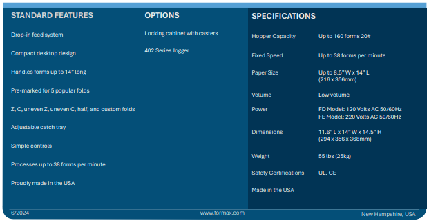 The clearly marked fold plates, simple ergonomic controls and drop-in feed system provide easy set-up and operation, right out of the box. These features, plus a compact desktop design, make the FD 1202 ideal for any office environment with low-volume applications. A processing speed of up to 38 forms per minute and the added capability of processing 14” forms enable operators to complete daily processing jobs with ease.