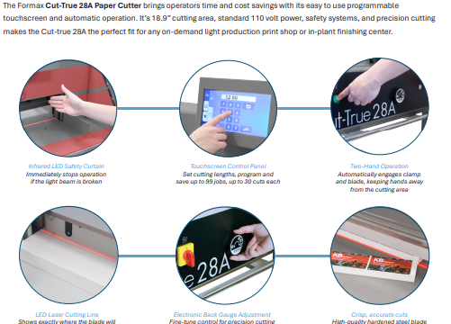 The Cut-True 28A is ideal for transforming large sheets into brochures, invitations and more, with crisp, accurate cuts, and is a welcome addition to print shops and in-plant finishing operations.