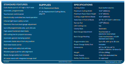 The Formax Cut-True 28A Electric Guillotine Paper Cutter offers precision cutting for paper stacks up to 18.9” wide. User-friendly, intuitive features include a touchscreen control panel, automatically-adjusting back gauge and the capacity to program up to 99 jobs with up to 30 cuts each. An infrared light beam safety curtain provides safety and convenience as it shuts down operation if the light plane is interrupted.