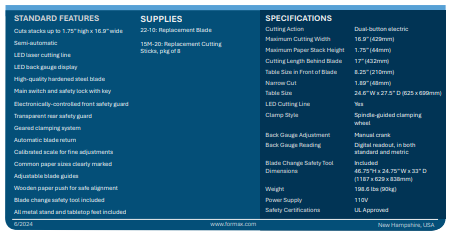 The 23S doesn’t sacrifice safety for accuracy. In fact, it features an electronically-controlled front safety cover, transparent rear cover, safety lock with key, blade lock, external blade depth adjustment, easy blade change access from the front of the cutter, and a wooden paper push for safe alignment. The rugged metal stand is included, providing a stable work surface, as well as feet for tabletop use.