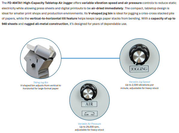 The FD 402TA1 Tabletop Air Jogger is an ideal solution for print shops and production houses with limited space. This compact, powerful model aligns and dries sheets in a single process while reducing static electricity. Variable vibration speed and air pressure controls combine to reduce jogging time, allowing press sheets and digital printouts to be air-dried immediately. Its V-shaped jog bin allows for jogging a criss-cross stacked pile of papers, while the vertical to horizontal tilt feature helps keeps large paper stacks from bending. It has three operating modes, and variable air pressure and speed control to process up to 940 sheets at a time in sizes up to 12" x 18"