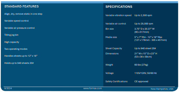 Formax FD 402TA1 Tabletop Air Jogger, Up to 2500 Vibrations per Minute, Variable Air Pressure Control, Tilting Jog Bin, Jogs up to 940 Sheets, 3 Operating Modes